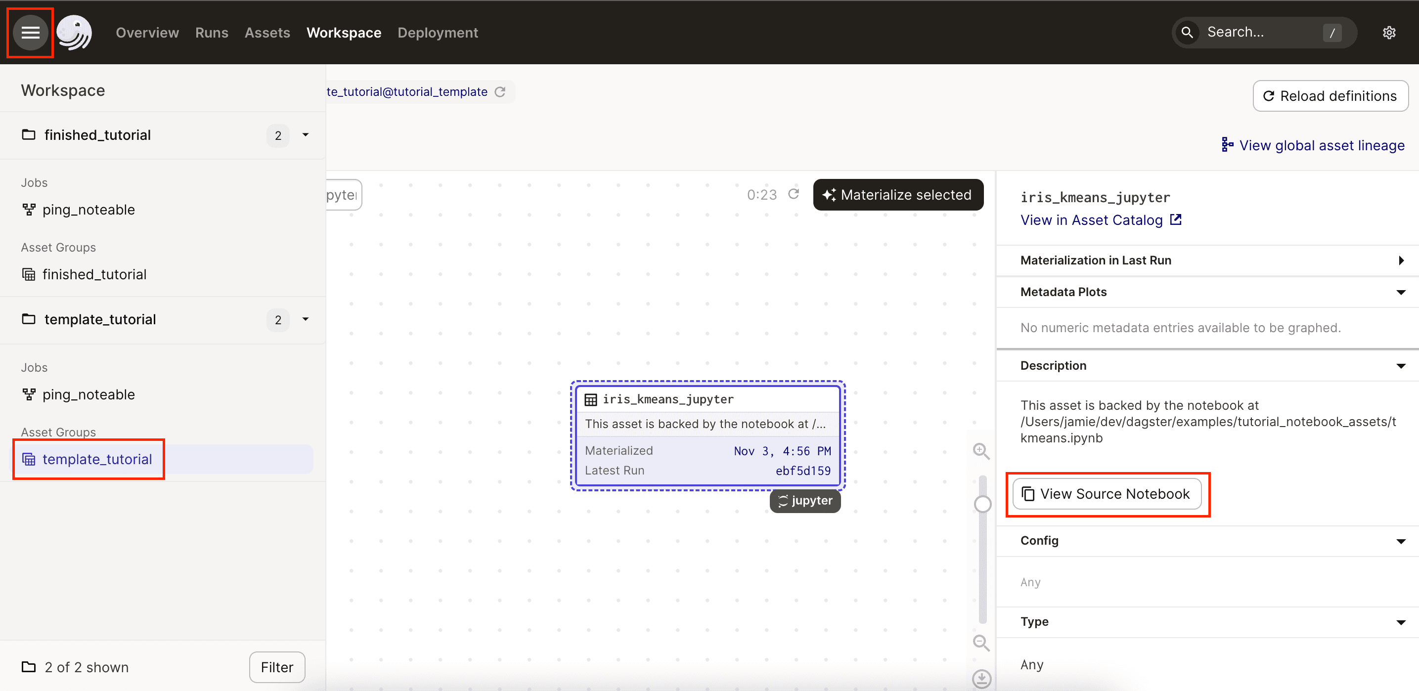 This button allows you to view the notebook directly in the UI. When clicked, Dagster will render the notebook - referenced in the notebook_path parameter - that'll be executed when the iris_kmeans_jupyter asset is materialized: